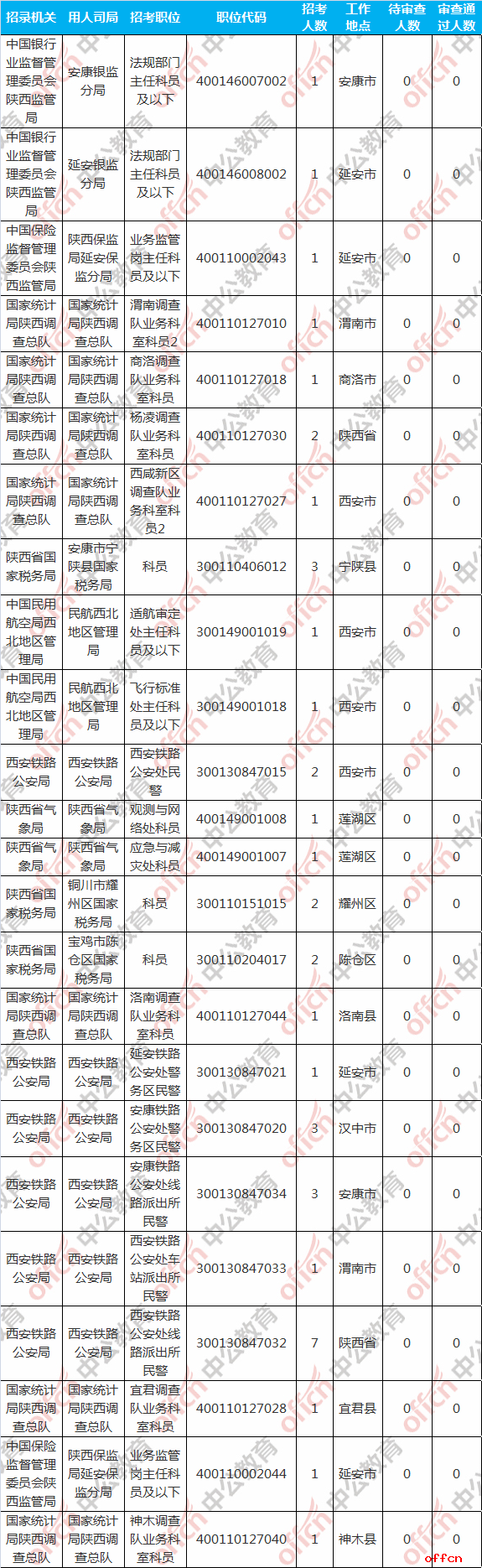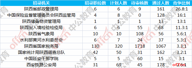 報名人數(shù)前十的職位主要集中在陜西省國家稅務(wù)局、西安鐵路監(jiān)督管理局、中國保險監(jiān)督管理委員會陜西監(jiān)管局等部門,具體信息如下: