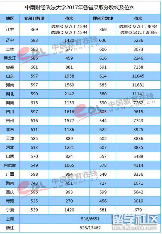 中南財經(jīng)政法大學(xué)2017年高考錄取分?jǐn)?shù)線及位次