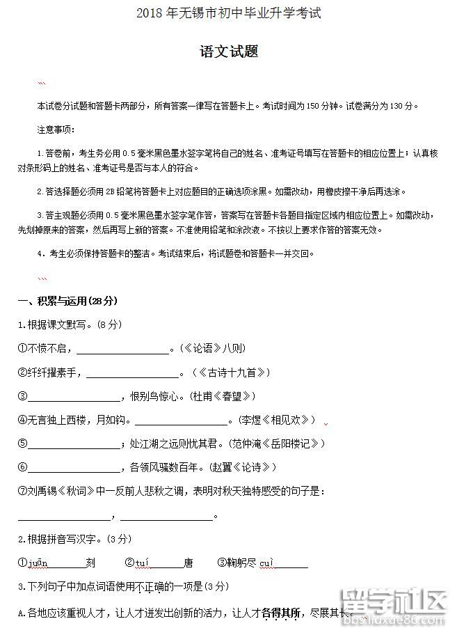 本網(wǎng)站中考欄目第一時(shí)間整理出《2018年江蘇無錫中考語文真題及答案》,希望對(duì)你有幫助。祝廣大考生取得優(yōu)異的成績(jī),考入理想的學(xué)校!