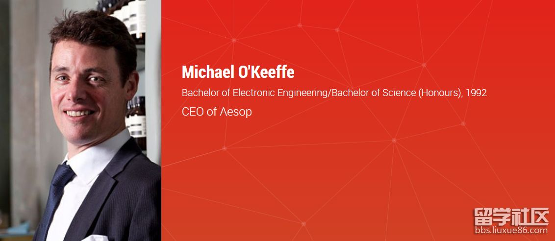 Michael O’Keeffe從完成樂卓博大學(xué)的工程學(xué)學(xué)位到領(lǐng)導(dǎo)世界上最成功的化妝品品牌,始終堅(jiān)守自己所規(guī)劃的職業(yè)道路。他從2003年起加入澳洲知名護(hù)膚品牌Aesop,目前已是這家公司的首席執(zhí)行官CEO。他一直致力于將本土品牌轉(zhuǎn)變?yōu)槿蚱放?,在全球開設(shè)了超過165家的分店。