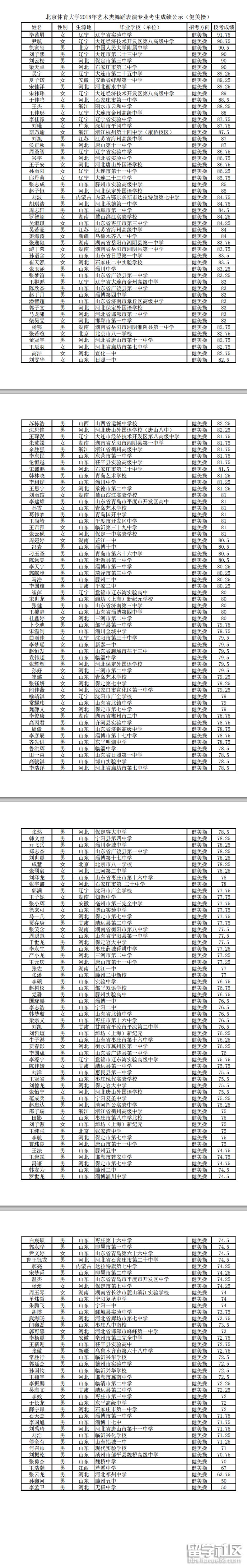 北京體育大學(xué)2018藝術(shù)類舞蹈表演專業(yè)考生成績(jī)(健美操)