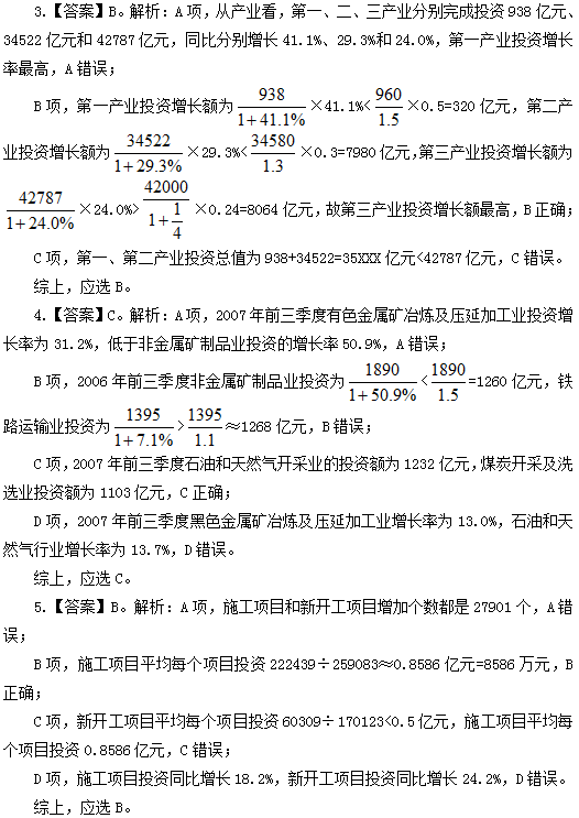 2.【答案】D。解析:2007年前三季度石油和天然氣開采業(yè)投資增長13.7%;煤炭開采及洗選業(yè)投資增長24.8%;房地產(chǎn)開發(fā)完成投資增長30.03%;有色金屬礦冶煉及壓延加工業(yè)投資增長31.2%。因此選D。