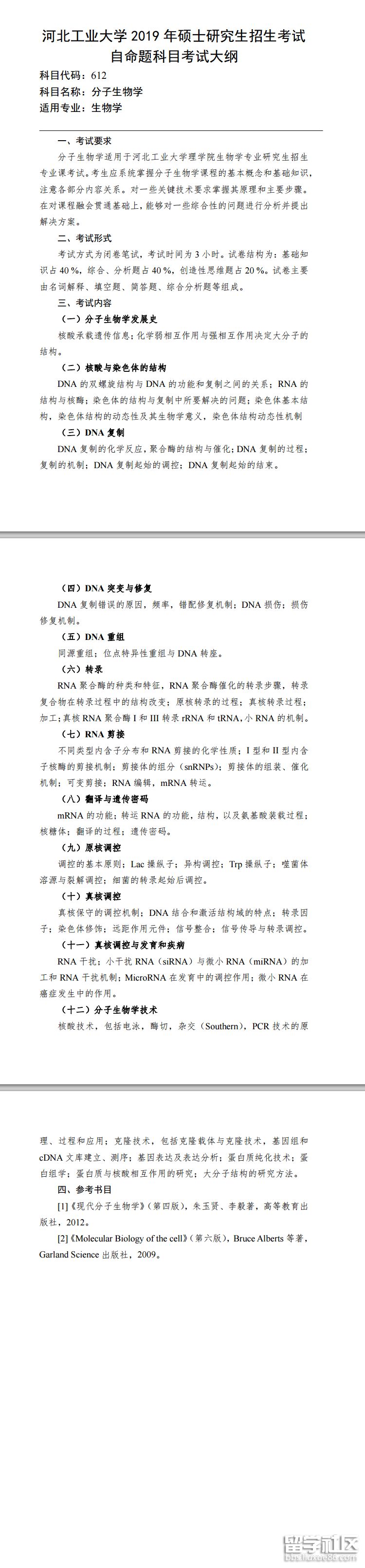 河北工業(yè)大學(xué)2019考研大綱:612分子生物學(xué)