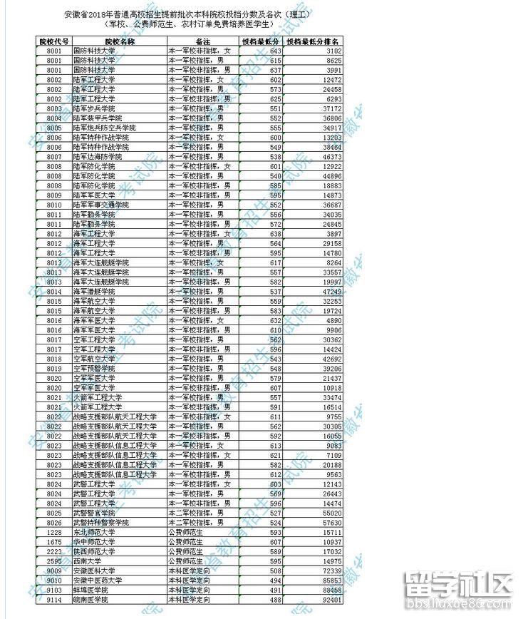 安徽省2018年提前批次軍校本科院校投檔分?jǐn)?shù)及名次