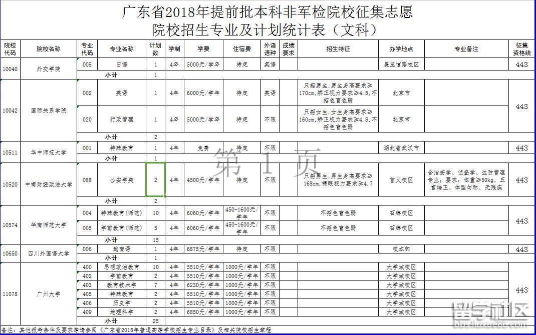 廣東2018提前批本科非軍檢院校征集志愿院校招生專業(yè)及計劃統(tǒng)計表(文科)