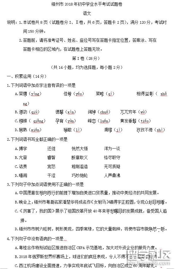 2018年廣西梧州中考完美收官,出國留學(xué)網(wǎng)中考欄目第一時間為您整理了《2018年廣西梧州中考語文試卷及答案》,希望可以幫到您,更多中考資訊請繼續(xù)關(guān)注本站!