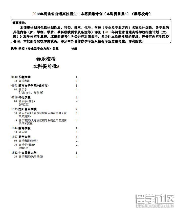 2018河北本科提前批A二志愿征集計劃(器樂???