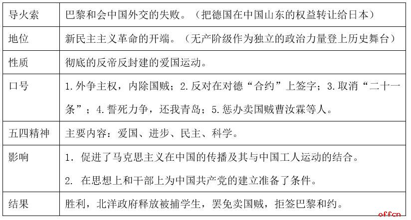 提到五四運動,出題人可能會考察它的地位、性質(zhì)、導火索、口號、影響與結(jié)果以及五四精神的核心內(nèi)容等歷史考點。下面以表格的形式總結(jié)下五四運動的歷史考點。