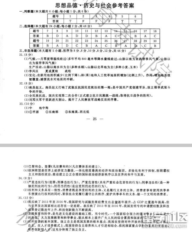 2017杭州中考思想品德、歷史與社會(huì)答案