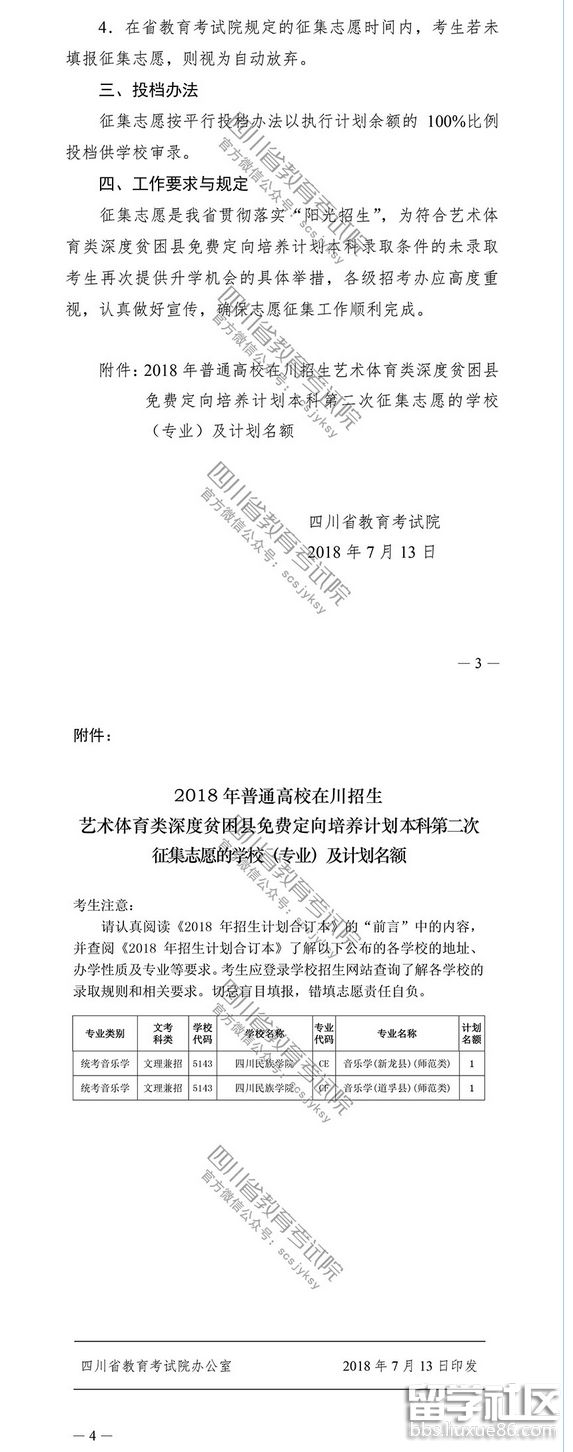 四川2018藝術體育類專業(yè)招生貧困縣免費定向培養(yǎng)計劃本科征集志愿