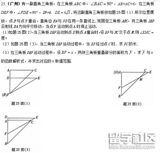 25.(廣東)有一副直角三角板,在三角板ABC中,,AB=AC=6,在三角板DEF中,,DF=4,.將這副直角三角板按如題25圖(1)所示位置擺放,點B與點F重合,直角邊BA與FD在同一條直線上.現(xiàn)固定三角板ABC,將三角板DEF沿射線BA方向平行移動,當點F運動到點A時停止運動. (1)如題25圖(2),當三角板DEF運動到點D到點A重合時,設EF與BC交于點M,則度;