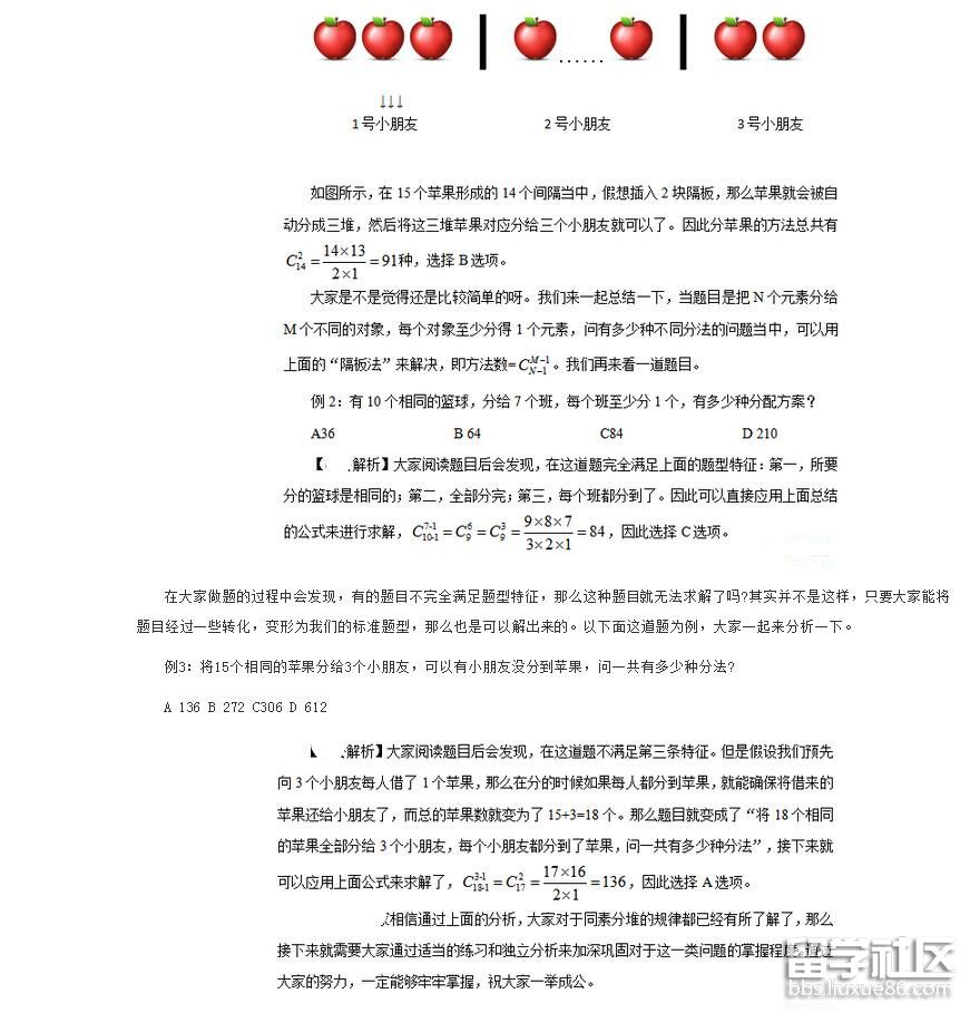 例1:將15個相同的蘋果全部分給3個小朋友,每個小朋友都分到了蘋果,問一共有多少種分法?