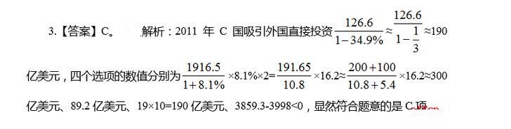 2.【答案】C。解析:2012年,A國的進(jìn)口額同比增長8.1%,B國的出口額同比增長15.5%,B國的貿(mào)易順差增長了76.2%,C國的出口額同比增長5.7%,增長最快的是C項(xiàng)。