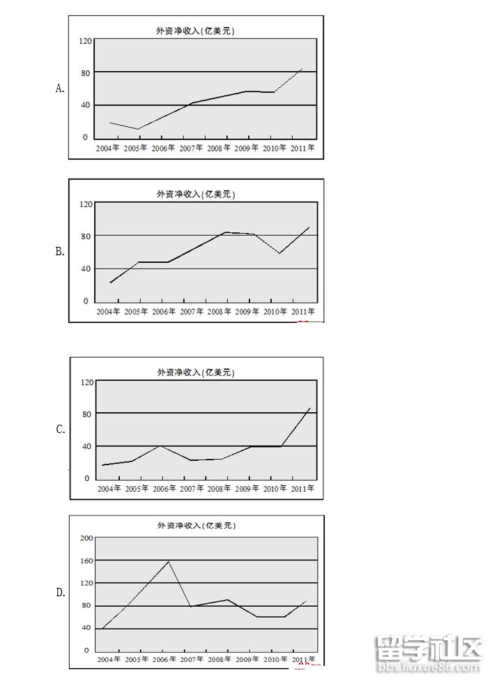 1.【答案】B。解析:2011年,B國(guó)外資凈流入為89.2億美元,比上一年增長(zhǎng)46.2%,比2004年增長(zhǎng)了319%;在2004-2011年,最高增長(zhǎng)率達(dá)到了134%,最低的增長(zhǎng)率為-29.5%,波動(dòng)幅度大。根據(jù)前面這段描述可大概推算,符合題意的是B項(xiàng)。