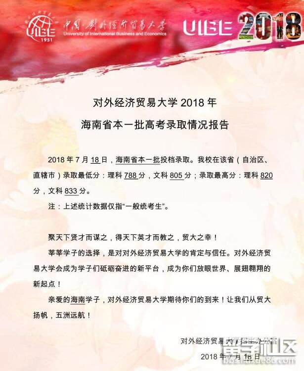 對外經(jīng)濟(jì)貿(mào)易大學(xué)2018年海南省本一批高考錄取分?jǐn)?shù)線