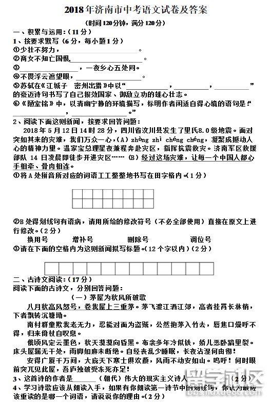 2018年中考已經(jīng)結束,你是否表現(xiàn)出了最優(yōu)秀的一面呢?本網(wǎng)站中考欄目為您提供《2018年山東濟南中考語文試題及答案》。如果您想要找的真題及答案沒有顯示,可按Ctrl+F5進行刷新。
