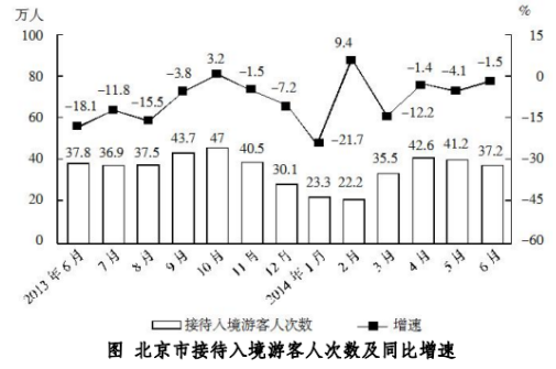 2014 年上半年,北京市接待旅游總?cè)藬?shù) 1.16 億人次,比上年同期增長 5.9%;實現(xiàn)旅游總收入 1907.2 億元,同比增長 8.2%。