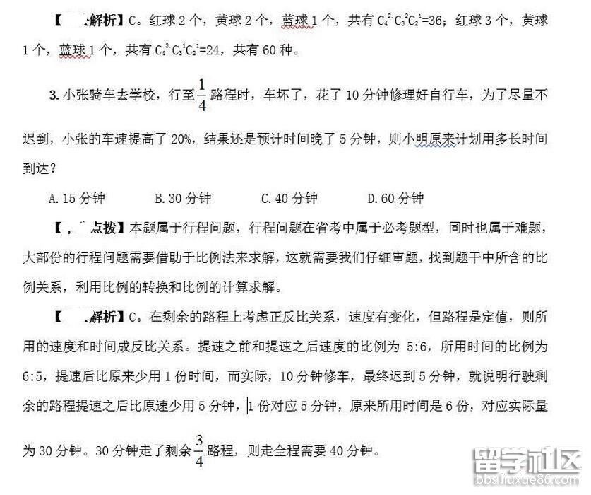 【點(diǎn)撥】本題屬于排列組合,需要用到分類分步思想,這類題型在省考中屬于難題,根據(jù)“紅球最多,黃球個(gè)數(shù)不少于藍(lán)球”這句話可以把問題分為兩大類分別求解,即2個(gè)紅球,2個(gè)黃球,1個(gè)藍(lán)球;3個(gè)紅球,1個(gè)黃球,1個(gè)藍(lán)球。