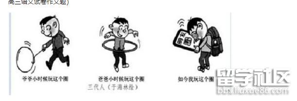 【文題解析】試題分析:本題考查能寫論述類、實(shí)用類和文學(xué)類文章的能力。本題是一則漫畫作文,漫畫的題目是《三代人》,漫畫的內(nèi)容是:爺爺小時(shí)候玩“滾鐵環(huán)”,爸爸小時(shí)候玩“呼啦圈”,如今“我”玩“朋友圈”。爸爸和爺爺小時(shí)候玩的“圈”是與運(yùn)動(dòng)健身有關(guān)的實(shí)物,充滿生機(jī)與活力。而“我”則利用通訊媒體虛擬的“朋友圈”與外界進(jìn)行交往,看似簡(jiǎn)單便捷,但缺少人與人面對(duì)面交流的生機(jī)與活力。并且,從漫畫中的三代人的表情看,爸爸和爺爺玩得興高采烈,而我身背一個(gè)大“書包”,戴著高度近視眼鏡,耷拉著腦袋,不難推斷出,繁重的學(xué)習(xí)任務(wù)已經(jīng)影響到“我”與伙伴的交往,“我”只能選擇“朋友圈”進(jìn)行交流。
