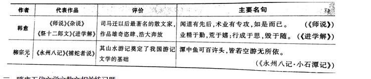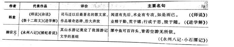 古文運(yùn)動是由韓愈領(lǐng)導(dǎo),得到柳宗元大力支持,有“韓門弟子”參加的,以“文以載道”相號召,以古文反對駢文的一場運(yùn)動。古文運(yùn)動扭轉(zhuǎn)了六朝至唐初駢文統(tǒng)治文壇的局面,在散文的思想與藝術(shù)發(fā)展上都取得了重大成就。上述二人代表作品、評價、主要名句如下表所示: