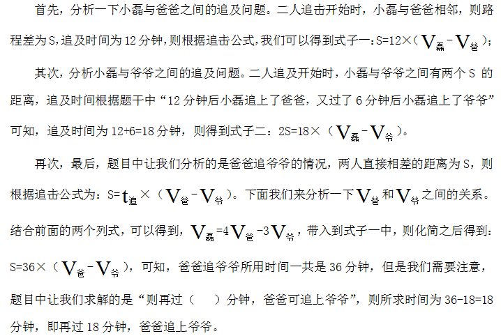 這是一道典型的追及問題,題目中涉及到的主體有三個,分別是爺爺、爸爸和小磊,三人在出發(fā)前的按照一定的順序晨跑且間距相等,因此,我們可以設相鄰兩人之間的距離為S。在此基礎上,我們分步驟來分析一下這道題目。