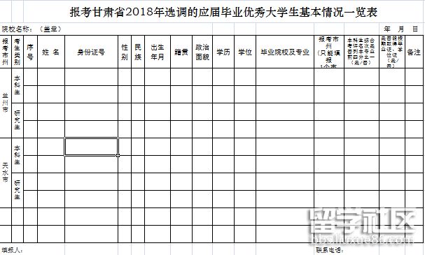 《報(bào)考甘肅省2018年選調(diào)的應(yīng)屆畢業(yè)優(yōu)秀大學(xué)生基本情況一覽表》