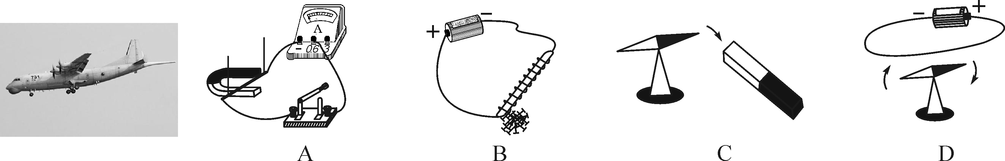 7.如圖為我國新型反潛巡邏機.機尾的“棍子”叫做磁異探測器,它能將潛艇經(jīng)過海域引起的磁場強弱變化轉化為強弱變化的電流,從而發(fā)現(xiàn)潛艇的存在.下圖能解釋磁異探測器工作原理的是( A )