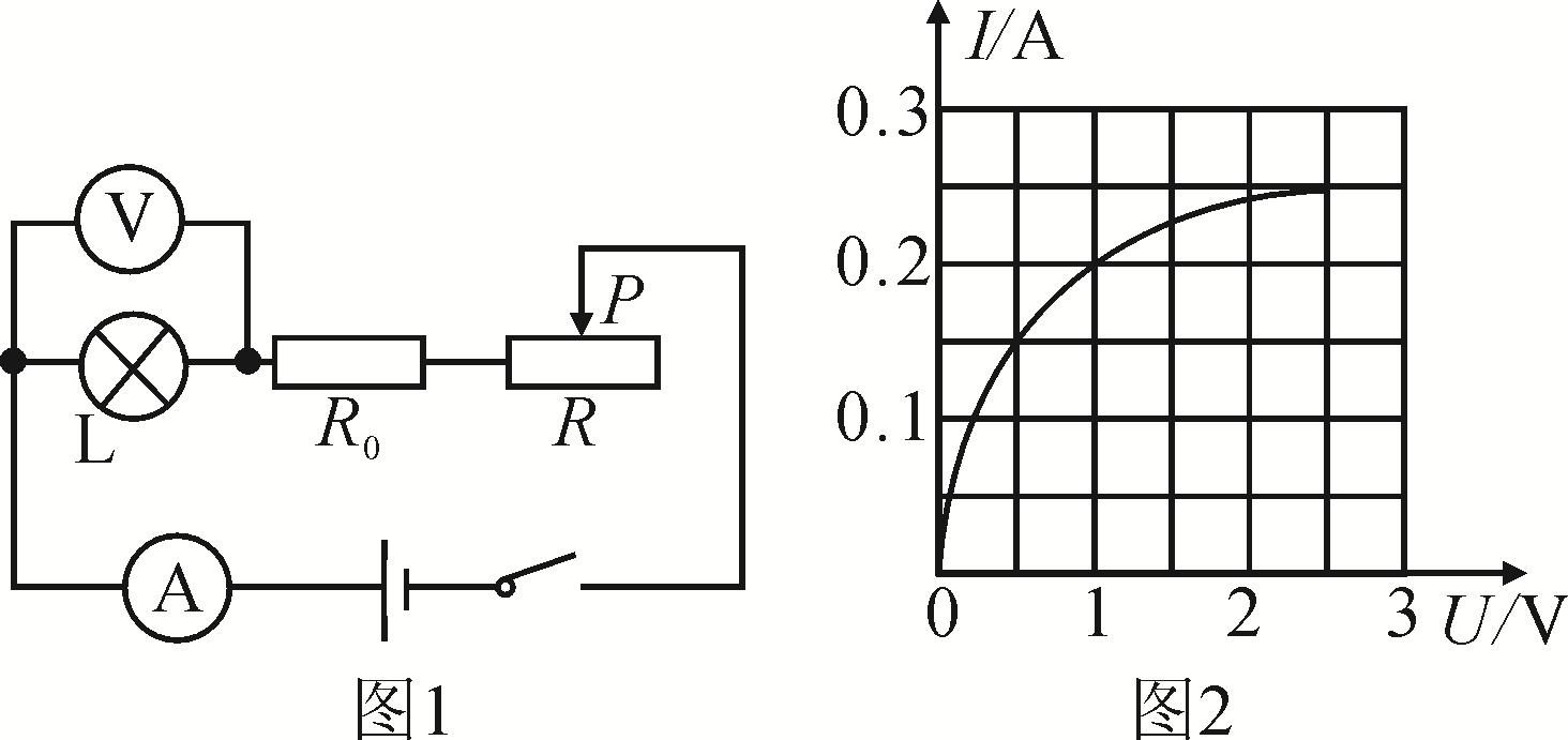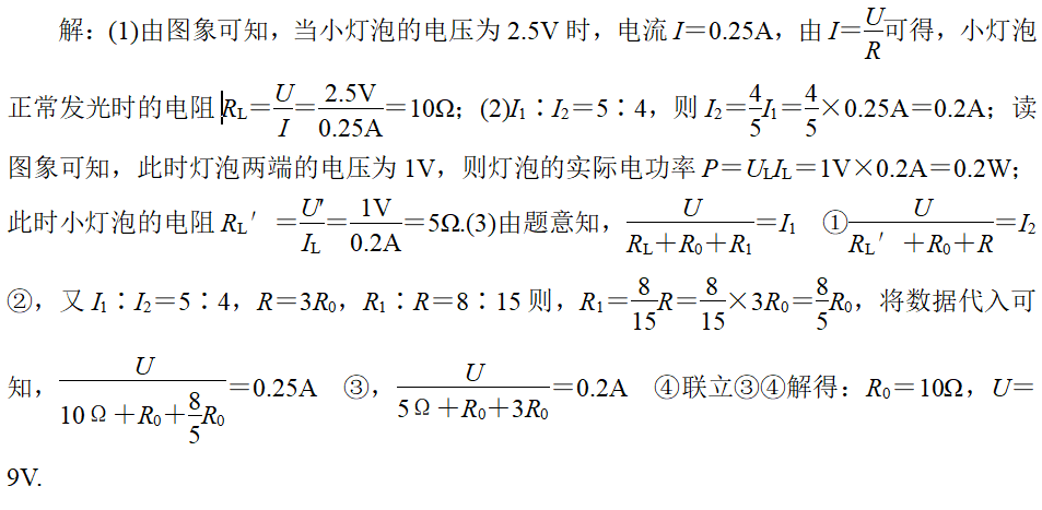 19.(8分)在如圖1所示的電路中,電源電壓不變,小燈泡的額定電壓為2.5V,變阻器的最大阻值R為定值電阻R0的三倍,閉合開關S,當滑片P置于某點時,電壓表示數(shù)為2.5V,電流表示數(shù)為I1,當滑片P置于最右端時,電流表示數(shù)為I2,且I1∶I2=5∶4,兩次變阻器連入電路的電阻之比R1∶R=8∶15.圖2是該小燈泡I-U圖象.求: