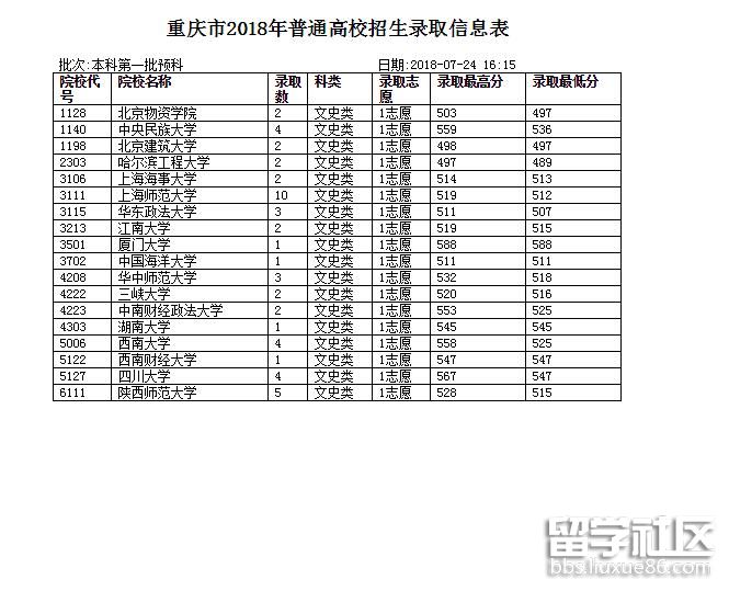 重慶市2018年本科第一批預(yù)科分?jǐn)?shù)線(文史類)