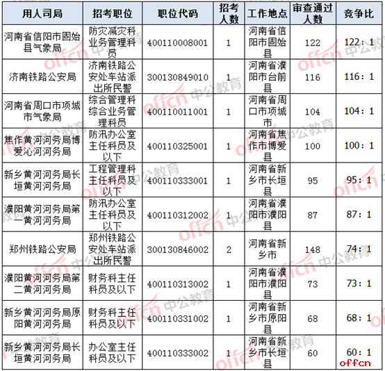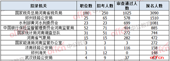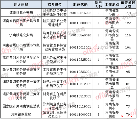 報名通過審核人數(shù)前十的職位主要出現(xiàn)在河南省氣象局、鄭州鐵路公安局、濟南鐵路公安局、水利部黃河水利委員會和國家統(tǒng)計局河南調(diào)查總隊,具體信息如下: