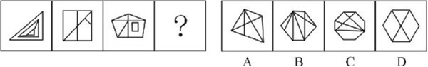 5.【解析】B。本題考查圖形內(nèi)外的重合邊數(shù),每個(gè)圖形由外部圖形與內(nèi)部黑色圖形構(gòu)成,第一列圖形內(nèi)外圖形的重合邊數(shù)分別為2,1,1,即2-1=1;第二列圖形內(nèi)外圖形的重合邊數(shù)分別為3,2,1,即3-2=1;由此可知第三列應(yīng)為1-0=1,即問(wèn)號(hào)處相重合邊應(yīng)為1條。B項(xiàng)當(dāng)選。
