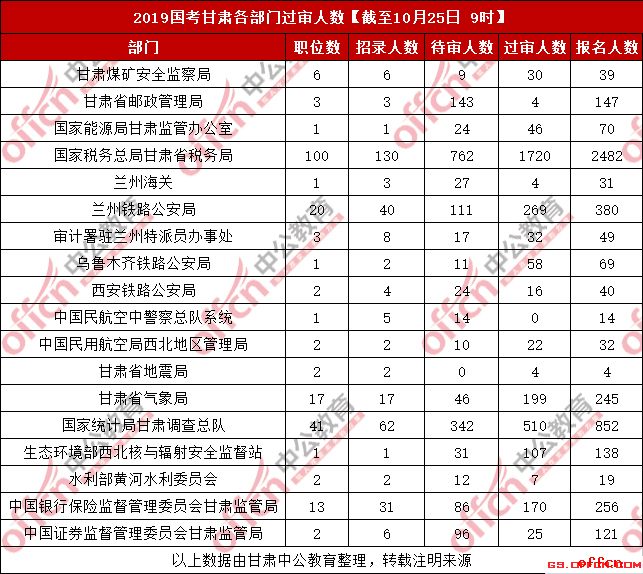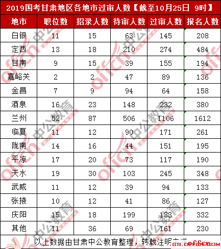 10月25日,2019國家公務(wù)員考試報(bào)名進(jìn)入第四天,據(jù)統(tǒng)計(jì),10月25日9時(shí),2019國考甘肅地區(qū)報(bào)名人數(shù)為4988人,過審人數(shù)為3223人,6個(gè)職位無人報(bào)考,平均競爭比例為9.9:1。提醒各位考生,此份數(shù)據(jù)審核時(shí)間截至到10月25日9時(shí)。