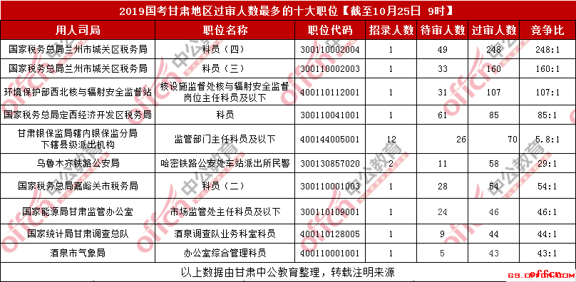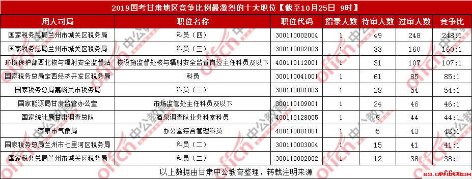 截至10月25日9時(shí),競爭比例最高的職位是國家稅務(wù)總局蘭州市城關(guān)區(qū)稅務(wù)局科員(四),招錄1人,過審人數(shù)為248人,競爭比248:1!具體信息如下: