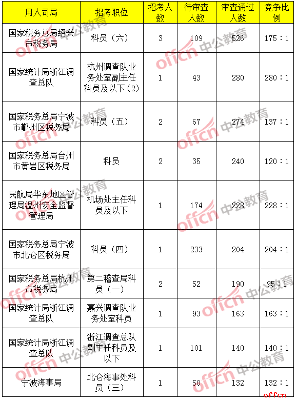 報名通過審核人數(shù)前十的職位主要集中在國家稅務總局紹興市稅務局、國家統(tǒng)計局浙江調查總隊、國家稅務總局寧波市鄞州區(qū)稅務局,具體信息如下:
