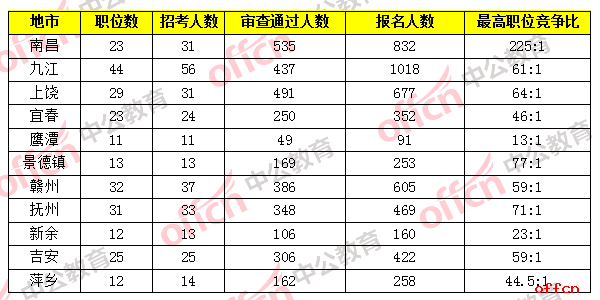截止到25日9時(shí),江西競(jìng)爭(zhēng)比例最高的地市為南昌,報(bào)名人數(shù)582人,競(jìng)爭(zhēng)比128:1。報(bào)名人數(shù)前三的地區(qū)是九江、南昌、上饒三個(gè)地區(qū),具體信息如下: