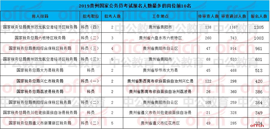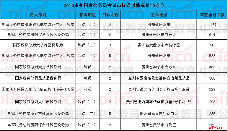 報名首日通過審核人數(shù)前十的職位基本集中在國家稅務(wù)總局貴州省稅務(wù)局,具體信息如下: