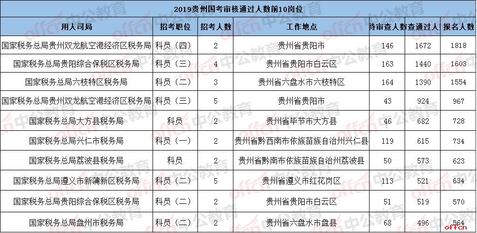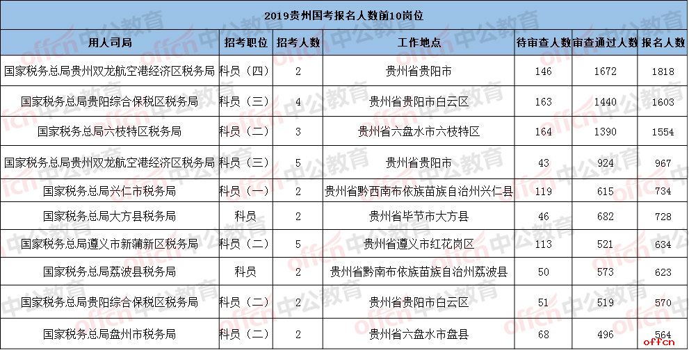 報名首日通過審核人數(shù)前十的職位基本集中在國家稅務(wù)總局貴州省稅務(wù)局,具體信息如下: