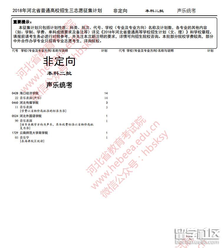 河北2018年本科二批三志愿征集計劃(聲樂統(tǒng)考)