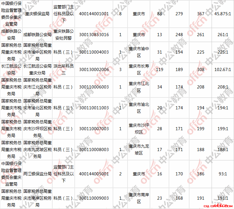 截至29日9時,中國銀行保險監(jiān)督管理委員會重慶監(jiān)管局-監(jiān)管部門主任及科員以下(職位代碼:400144001001)以367人的報名人數(shù)奪冠,但它的報錄比僅為45.875:1。目前,重慶有3個崗位報名人數(shù)超過三百;同時,3個崗位報名人數(shù)不超過5人,而其中水上消防科員支隊(職位代碼:300130003002)招聘4人,無人報考。建議還在觀望的考生可以多關注一下這些報名人數(shù)相對較少的職位。