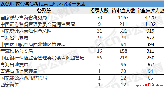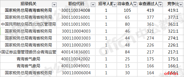 報名通過審核人數(shù)前十的職位主要集中在國家稅務總局青海省稅務局、中國民用航空局西北地區(qū)管理局、中國證券監(jiān)督管理委員會青海監(jiān)管局等部門,具體信息如下: