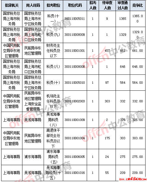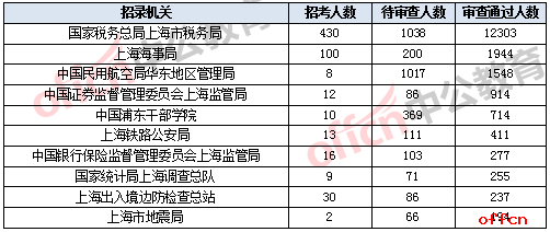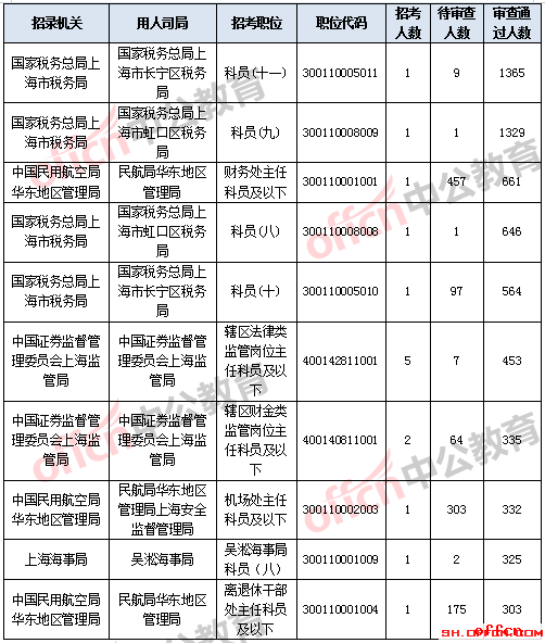 報名通過審核人數(shù)前十的職位主要集中在國家稅務(wù)總局上海市稅務(wù)局、中國民用航空局華東地區(qū)管理局等部門,具體信息如下:
