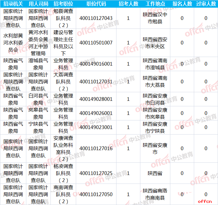 截止到29日16時(shí),工作地點(diǎn)在陜西的職位共有10個(gè)無人報(bào)考,占全部職位的4.39%。去年同期無人報(bào)考職位占1%%。下面是無人報(bào)考職位一覽表,專家建議廣大考生多關(guān)注一些較冷職位,避免激烈競爭,結(jié)合自身?xiàng)l件,找到屬于自己的最佳職位。