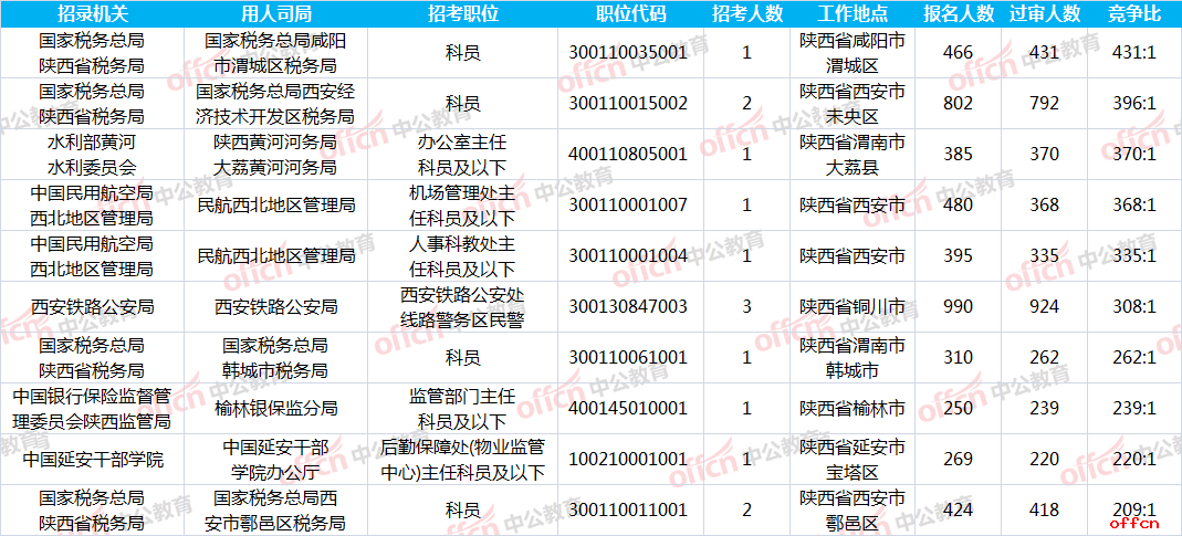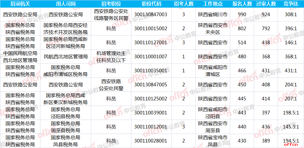 報(bào)名人數(shù)較多的前十職位主要集中在西安鐵路公安局、國家稅務(wù)總局陜西省稅務(wù)局、中國民用航空局西北地區(qū)管理局等部門,具體信息如下: