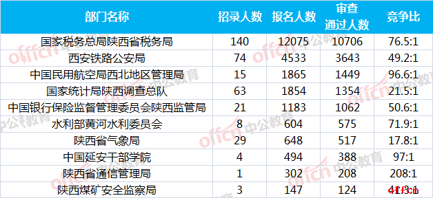 從競爭比來講,目前競爭比最高的部門為陜西省通信管理局,達(dá)到208人競爭1個(gè)職位,競爭比為208:1,去年此時(shí),競爭比最高的部門為陜西省郵政管理局,競爭比為108:1。
