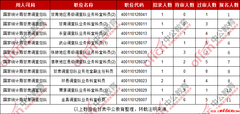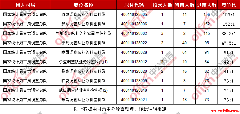 2019國(guó)考甘肅考區(qū)國(guó)家統(tǒng)計(jì)局甘肅調(diào)查總隊(duì)過(guò)審人數(shù)最多的十大職位(截至29日16時(shí))