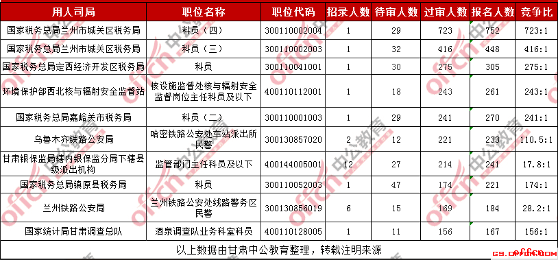 2019國(guó)考甘肅考區(qū)競(jìng)爭(zhēng)最激烈的十大職位(截至29日16時(shí))