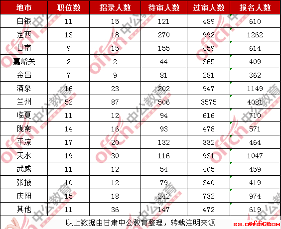 為幫助廣大考生更清晰的了解今日?qǐng)?bào)名情況,整理了甘肅地區(qū)十八部門報(bào)名數(shù)據(jù)情況,供廣大考生參考: