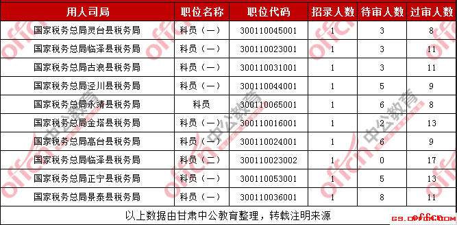 國(guó)家稅務(wù)總局白銀市靈臺(tái)縣稅務(wù)局-科員(一)報(bào)名人數(shù)最少,招錄1人,8人過(guò)審,11人報(bào)名,以下是國(guó)稅系統(tǒng)過(guò)審人數(shù)最少的十大職位: