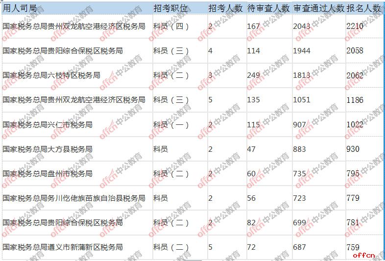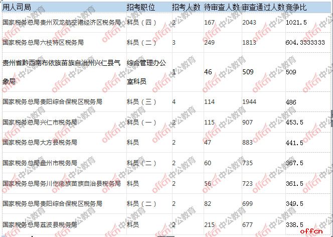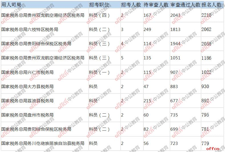 報名首日通過審核人數(shù)前十的職位基本集中在國家稅務總局貴州省稅務局,具體信息如下: