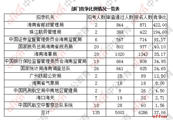 從競爭比來講,目前競爭比最高的部門為海南省郵政管理局,達到422人競爭1個職位。